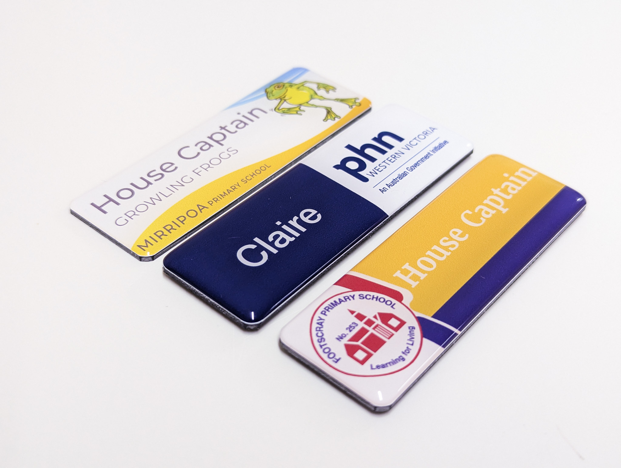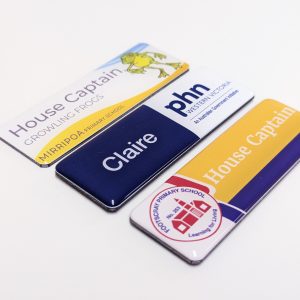 Our most popular style of badge features a resin dome finish for a sleek, professional look and are available with either magnet or safety pin backings to suit your school’s needs. There are many different finishing options however, some of which are pictured below.