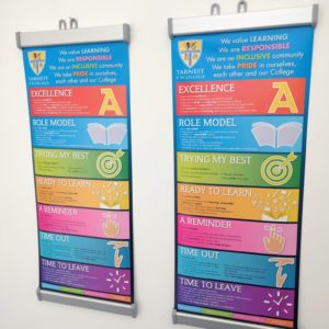 Drop Down Banners are also trending in popularity with many schools as they provide the perfect way to display relevant content throughout school classrooms and administration areas. We see them used for curriculum aids, school branding, house mascot hangings, culture awareness campaigns like anti bullying and positive behaviour affirmations, and much more.